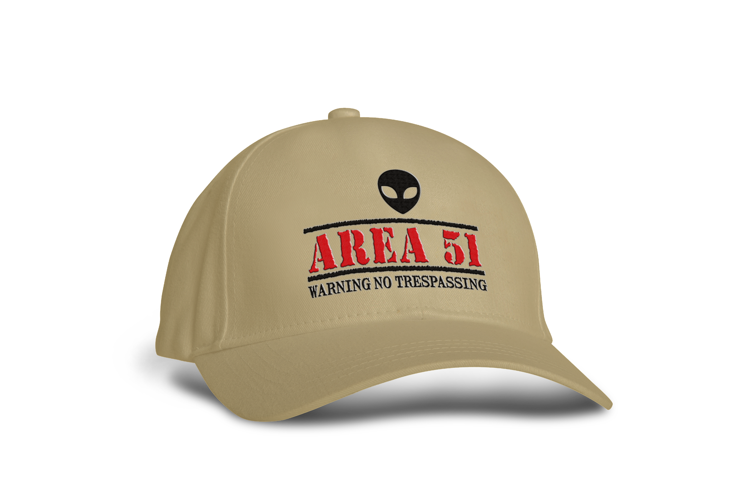 O boné que melhor representa a base militar mais secreta do mundo, situada no estado do Nevada, nos Estados Unidos, e que durante os anos 50 e 60 era o local para onde foram levadas naves alienígenas abatidas ou acidentadas em Território Americano. No subtítulo a expressão “Warning No Trespassing”, bordada na peça, é uma advertência aos curiosos para que não adentrem a unidade militar, sob risco de prisão.